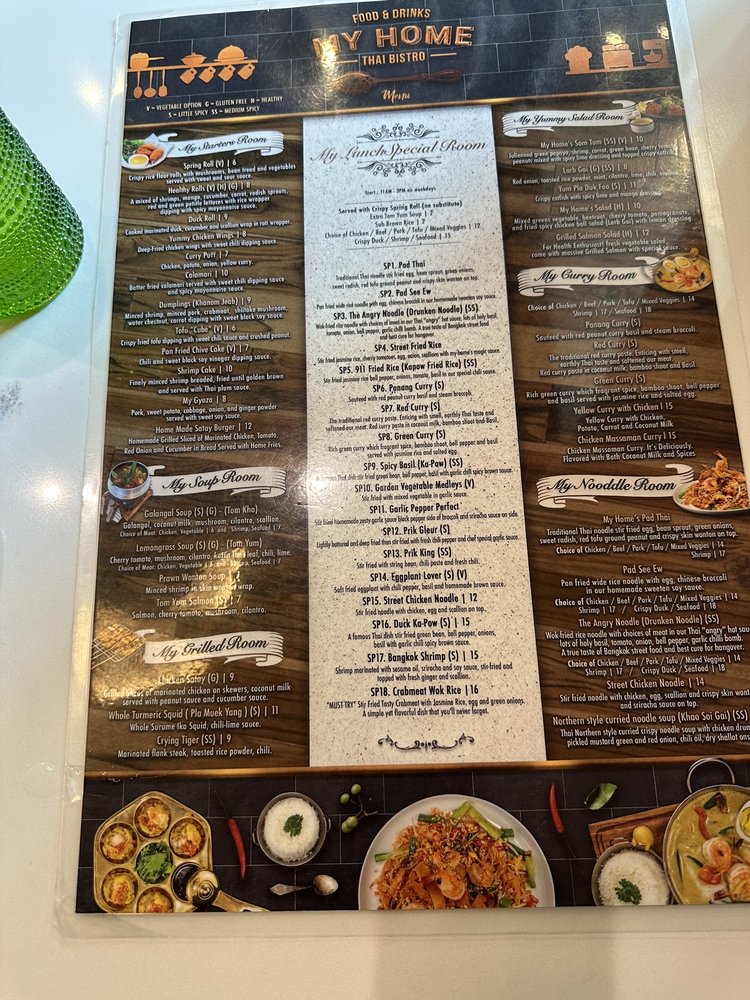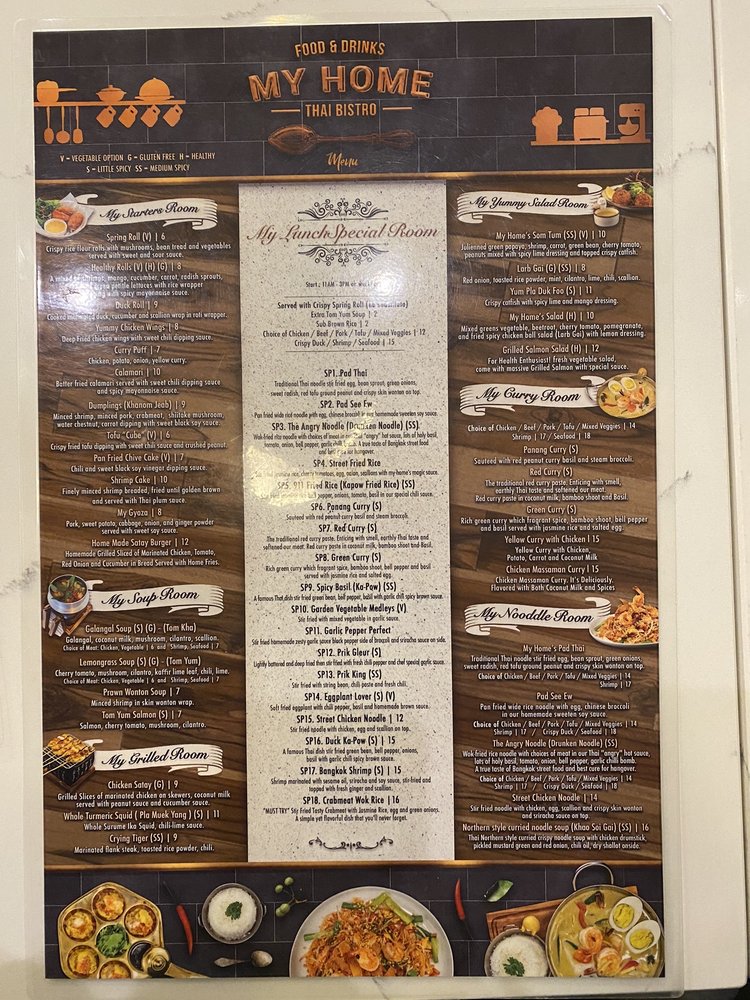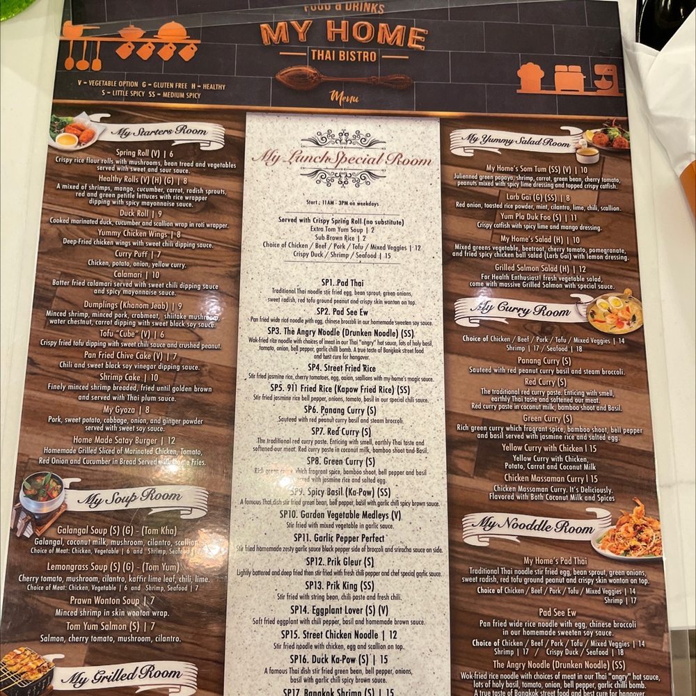 Welcome to MyHome Thai Bistro, an enchanting Thai culinary destination nestled in Reston, VA. Here, you embark on a flavorful journey with a menu designed to tantalize your taste buds. Start your meal with alluring starters like the crispy Tofu Cube or the delectable Shrimp Cake, both perfect for sharing. The standout dishes in the My Home Signatures Room include the mouthwatering Bangkok Shrimp, marinated to perfection, and the spicy Goong Prik Gleur, showcasing fresh, bold flavors.